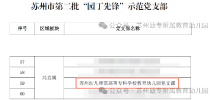 近日,中共苏州市委教育工作委员会公布第二批全市中小学校“园丁先锋”党建文化品牌示范学校、示范党支部、示范岗名单,苏州幼儿师范高等专科学校附属教育幼儿园党支部获评苏州市第二批“园丁先锋”示范党支部。